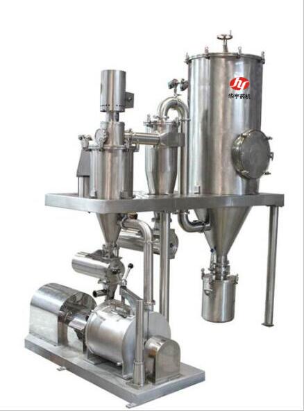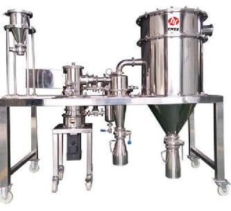 本機(jī)主要有粉碎機(jī)、篩粉機(jī)、旋風(fēng)分離器、除塵布袋,操作平臺(tái)、電器控制箱等部分組成。原料首先經(jīng)過除鐵器進(jìn)入粉碎機(jī),粉碎后由風(fēng)送到分離器,經(jīng)過分離器出料口進(jìn)入篩粉機(jī)入料口,由篩粉機(jī)主軸帶動(dòng)絞龍自動(dòng)喂料,同時(shí)帶動(dòng)導(dǎo)向推板將粉末推進(jìn),細(xì)粉經(jīng)過篩網(wǎng)落入布袋,粗粉返回粉碎機(jī)內(nèi)再粉碎。