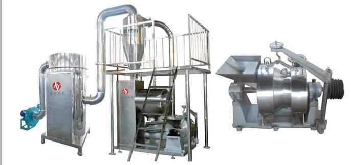 本機主要有粉碎機、篩粉機、旋風分離器、除塵布袋,操作平臺、電器控制箱等部分組成。原料首先經(jīng)過除鐵器進入粉碎機,粉碎后由風送到分離器,經(jīng)過分離器出料口進入篩粉機入料口,由篩粉機主軸帶動絞龍自動喂料,同時帶動導向推板將粉末推進,細粉經(jīng)過篩網(wǎng)落入布袋,粗粉返回粉碎機內再粉碎。